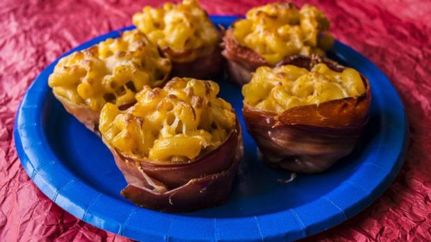 En el recipiente con aceite colocar el jamón serrano o el tocino a los alrededores para formar un contenedor. Poner la mezcla de mac&cheese adentro y encima mucho queso cheddar rallado.