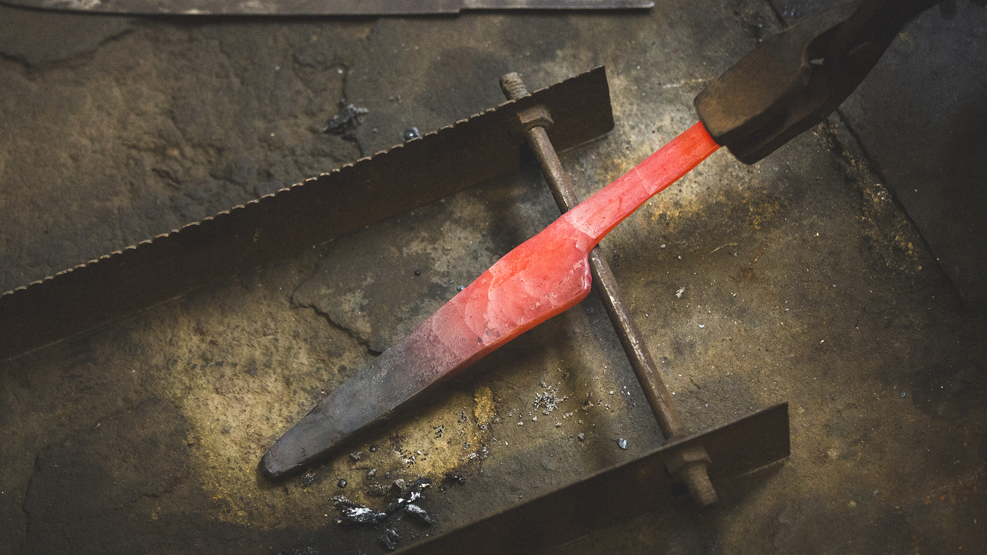 No hay termómetro. Cuando el ojo del maestro detecta que el tono de rojo es el adecuado extrae del carbón la pieza, la enfría en agua y empieza a moldear a golpes la hoja. Después, de nuevo al carbón y se repite el ciclo, que ellos llaman yaki-ire, y que endurece paulatinamente el cuerpo del futuro cuchillo. El resultado es un hoja formada por una base de hierro flexible y un filo de acero duro, recto y rígido.