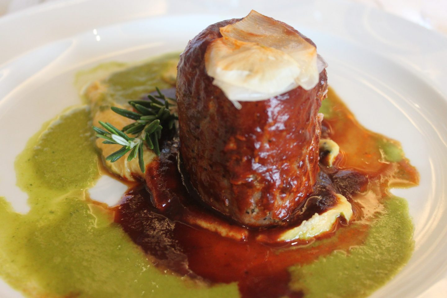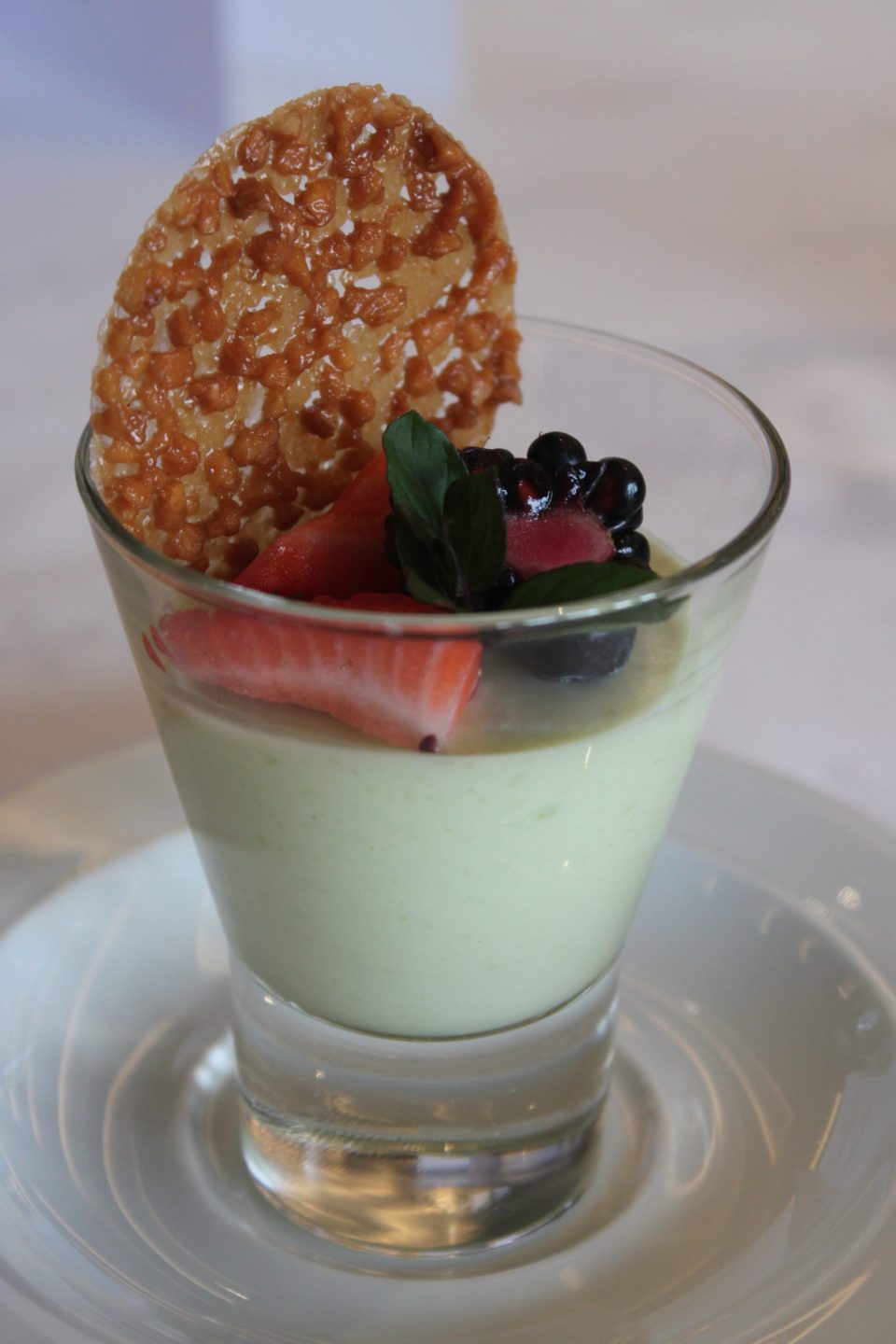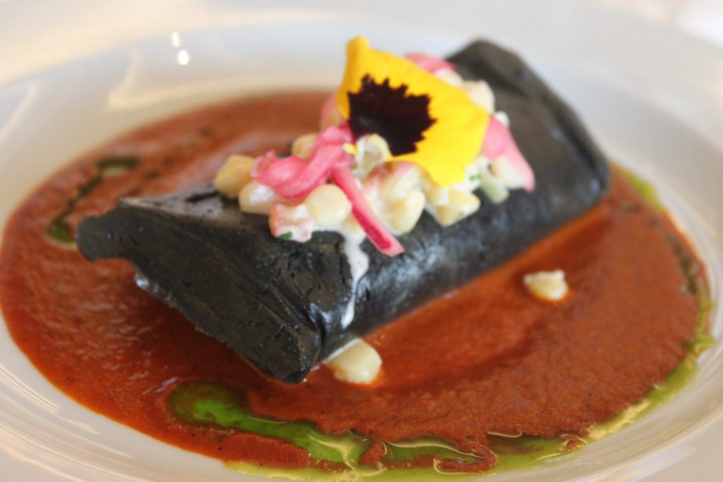 Se sirvió un tamal de huitlacoche y requesón con salsa de chile guajillo; filete de res en salsa de chile ancho con puré de plátano y una panna cotta de aguacate con cardamomo.