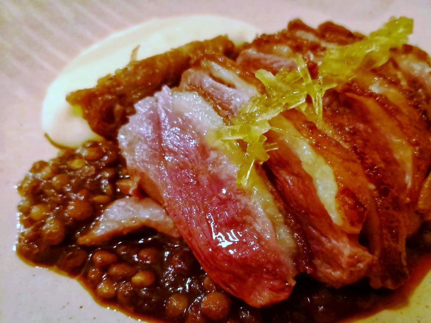 Los platos fuertes muestran la diversidad de este menú que no podemos clasificar ya que tiene opciones sudamericanas, mexicanas y europeas. Nos decidimos por un clásico francés revisitado, el magret de pato, asado al sartén, con cremoso de lenteja, puré de papa, cebolla caramelizada y mandarina confitada.