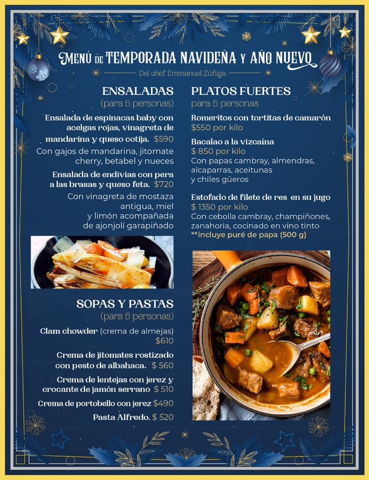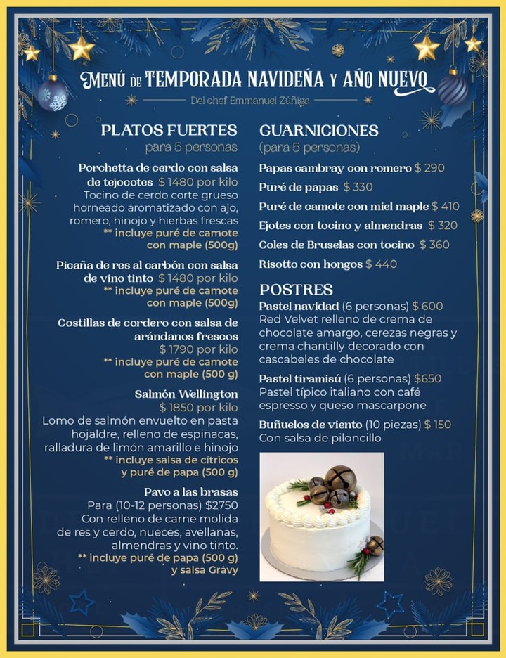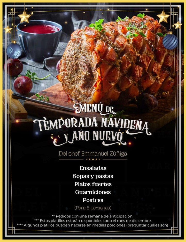 Esta es la dark kitchen de un gran cocinero mexicano: Emmanuel Zúñiga, quien estuvo al frente del delicioso restaurante Lampuga durante muchos años; así que es garantía de que la comida está rica y tendrás una cena navideña deliciosa. El menú es bastante amplio, desde porchetta de cerdo en salsa de tejocote hasta pavo a las brasas y salmón Wellington. Aquí puedes ver el menú completo: